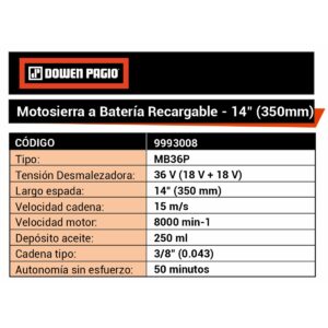 Motosierra A Batería Recargable 14” Dowen Pagio